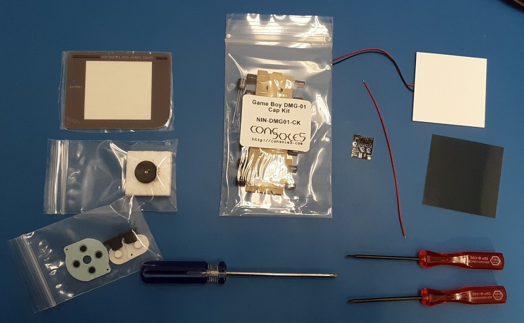 So just as I said this was the “first pass” of parts that I purchased. Many of the items ended up not being in the Game Boy when I was finally finished. I broke the new Glass Screen cover, I did not use the replacement Volume pot, I did install most of the Cap Kit. The Button pads, were the wrong ones for the DMG. There also a back light kit with the Bivert board that I installed initially. Finally some Triwing drivers. It turns out my early Game Boy doesn’t have any Triwing Screws in it. It is all Philips screws. It isn’t in the picture, but as I had concerns about audio I did get a speaker as well, which I did not use.