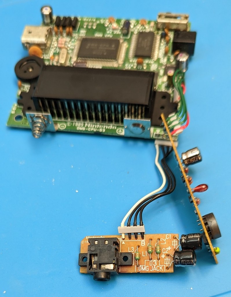 Last week after getting the SGB Console done and the Multiplayer tested I took a look at the DMG again. The audio is completely dead out of the speaker. I plugged in head phones and only had one channel of the audio and a lot of buzzing. I then took it apart, looking it over I didn’t see anything obviously wrong. The capacitors that were changed looked fine. I was able to tell that the CPU Board had 5 original capacitors still on it, as only one was replaced on it. The Audio Jack which was still a question for me has a lot of oxidation on all the exposed metal on it. I have seen other connectors do this at times. This socket has a switch in it that disables the audio. I had previously tried to clean it with contact cleaner but nothing changed.